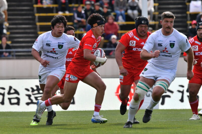 ホストゲームに迎え撃つのは、昨シーズン1勝1敗と、ビジターゲームで黒星を喫した相模原DB。雪で中止になった3月7日の第7節東京SG戦では強いFWがブレイクダウンで圧力をかけて、相手の早い球出しを阻止し、思うようなアタックをさせずに勝利した。神戸Sはbrutality(容赦なく)の気持ちを持って戦い、自分たちのラグビーを遂行したいところ。7,146人が見守る中でキックオフを迎えた試合は、前半、風下に立つ中でボールキープしながら神戸Sらしい多彩なアタックが炸裂し、トライの山を築いていく。スコアボードはいきなり動く。3分、WTB松永の突破からパスを繋いで、フェイズを重ねて、LOレタリックが強いキャリーを見せてゴール前まで迫ると右中間ラックからSH上村、FLサベアとボールが渡り、最後はCTBレイナートブラウンが先制のトライ。9分にはFB上ノ坊のラインブレイクからチャンスを作り、パスを繋いで、WTB松永がフィニッシュ。キックカウンターやターンオーバーといったアンストラクチャーからどんどん仕掛ける神戸S。14分にはFB上ノ坊のオフロードパスを受けたFLコストリーが、21分にはSO李がトライをマークする。前半終了までに7トライを奪って47-0で折り返した。