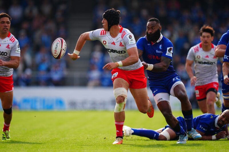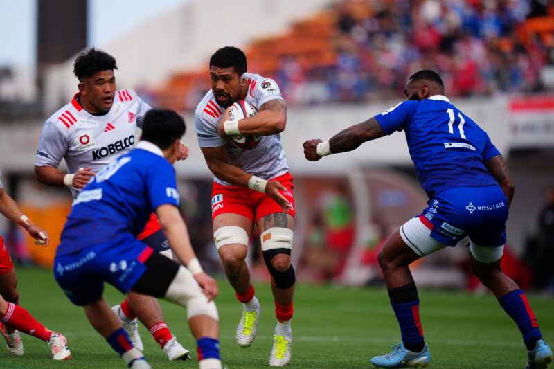 前節のホストゲームで第11節を終えた時点で最下位の横浜キヤノンイーグルスに敗れた神戸Sは、4勝8敗で7位の静岡BRと対戦。前節は相手の必死さ、激しさを前に終始受けに回りプランを遂行できずに敗戦し、第2節から続いた連勝が10でストップ、首位から3位に順位を落とした。対する静岡BRは前節でトヨタVに勝利し、5連敗から脱出。前節は対照的な結果になった両チームの対戦となる。神戸Sは今節、21日に行われたトレーニングマッチSA広島戦で5トライをマークした2026年度新加入選手、NO8ポルテレがアーリーエントリーとして初めてリザーブに入るなど、前節の結果を踏まえてメンバーを変更。「前節はやるべきことをちゃんと理解できていなかったり、どこかで大丈夫だろうと思っていたり、そんな選手がいたように思います。前節の敗戦から学んだことを今節に繋げられるようにしたい」とレニーHC。共同キャプテンの李は「一人一人のマインドセットのところを求めて準備してきました。ただ、前節は残念な結果でしたが、それまでに10連勝をしています。自信を持ってポジティブなマインドで戦いに挑もうとレタリックと共にリードしてきました」といい、強い気持ちで敵地・IAIスタジアム日本平に乗り込んだ。スタジアムは熱狂的な応援で知られるレヴニスタで青一色。そんな中、関西や関東からスティールメイツが来場し、試合前からチームにパワーを送ってくれる。その声援に応えるかのように、神戸Sが開始からエンジン全開で相手に襲いかかる。SO李のキックオフをチェイスしたFB上ノ坊がボールをタップし、CTBイオアサに繋いで敵陣へ。CTBイオアサの手からボールがこぼれて静岡BRボールのスクラムとなったが、相手の強みであるスクラムで反則を獲得すると、4分、22mライン付近でのマイボールラインアウトから展開し、一度はボールを奪われるも暴れたボールをSH上村が拾い上げパスを繋いで、LOカウリートゥイオティが先制トライをマークする。12分にも早いテンポで連続攻撃を仕掛けると、4試合ぶりにスタメン復帰のWTB植田がラインブレイクし、最後はSH上村からパスを受けたFB上ノ坊が走り切りフィニッシュ。さらに17分にもWTBブルアのランからサポートしていたSH上村にパスが渡り、そのままトライゾーンへ。3連続トライで21-0とリードする。この日の神戸Sはアタックだけでなく、ディフェンスでもハードワークする。25分に不用意な反則から攻め込まれるも、粘りのディフェンスでトライラインを守り切る。34分にPGで加点を許すも、その直後のキックオフからの静岡BRの攻撃でLOダグラスに反則があり、ゴール前でマイボールラインアウトのチャンス。スティールメイツから「取り切れー!」と声援が送られる中でサインプレーを決めてCTBイオアサがトライ。その後、スクラムで反則を与えると、ゴール前での静岡BRボールラインアウトのピンチに。モールを押し込まれるも相手にオブストラクションの反則があり、前半はトライを許すことなく、26-3で折り返した。