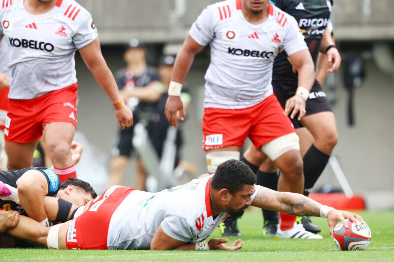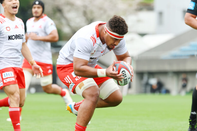 第12節の横浜Eとの痛い敗戦を成長に繋げて、敵地で行われた前節静岡BR戦で勝利を収めリーグ戦6位以内が確定し、プレーオフトーナメント進出が決まった神戸S。秩父宮ラグビー場で対戦するのは、8勝5敗で5位につけるBR東京。今節はプレーオフを最高の状態で臨むためにコンディション面を考慮し共同キャプテンのLOレタリック、UTB李をリザーブに回して、FLサベアが神戸Sで初めてゲームキャプテンを務めた。レニーディレクターオブラグビー/ヘッドコーチ(HC)が「強くて素晴らしいチーム」と警戒し、セットプレーの安定が光るBR東京に対して、神戸Sはキックオフから相手の強靭なフィジカルに受けることなく、逆に乗り勝ってアタック。2分、ハーフライン付近でのラインアウトからモールを押し込み10m前進し展開するとCTBイオアサが抜け出し、サポートしていたNO8フナキが先制トライ。4試合ぶりに『10番』を背負うSOガットランドのゴールキックも決まり、7-0と幸先の良い滑り出し。その直後、自陣での反則から相手に攻撃の機会を与えるも、22mライン内に入られたところでFLサベアがボールをもぎ取りピンチを脱する。さらに10分には、ゴール前ラインアウトからテンポよくパスを繋いで、CTBレイナートブラウンからオフロードパスを受けたFLフナキが連続トライ。その後、互いにキックを使いながら中盤で一進一退の攻防が続く。23分、BR東京はスクラムで反則を得るとショットを選択するが、SO中楠のキックは外れて失敗に終わると、神戸Sはドロップアウトで短いキックを使って攻撃を継続。ハーフライン付近まで前進するとCTBレイナートブラウンがディフェンスの裏へと抜け出し、LOカウリートゥイオティがビッグゲイン、SH上村に繋いで、最後は再びLOカウリートゥイオティがパスを受けて、そのままトライゾーンへ。ゴールキックも決まり、21-0とリードを広げた。しかし、直後のキックオフからボールを確保し展開したところで反則があり、SHペレナラに速攻を仕掛けられて、FL松橋がトライ。ここからスコアボードが激しく動き出す。29分、WTB西川がBR東京陣22mライン内から蹴ったダイレクトキックが味方の持ち込んだ後のものとして、ゴール前で神戸Sボールのラインアウトになると、HOディクソンの投げ込んだボールをLO小瀧がキャッチし、すぐさまFLサベアにパスを回して、そのままトライゾーンへ。SOガットランドのゴールキックが決まり、神戸Sでの総得点数が501となり、チーム史上初の500得点を達成した。その喜びも束の間、カウンターアタックから前進を許して連続攻撃を受けるとゴール前まで迫られる。PR谷口がトライゾーンへと飛び込むも、間一髪、SOガットランドがグラウンディングを阻止。しかし、神戸Sに立て続けに反則があり、34分、ゴール前でのスクラムからFWが近場をついて、最後はSHペレナラがトライ。ゴールキックも決まり、28-14に。取られたら取り返す神戸Sは、37分、相手が高く蹴り上げたキックをハーフライン付近でCTBイオアサがキャッチし、そこからFW、BK一体となった攻撃で前進し、最後はSOガットランドのキックパスをFB上ノ坊が右端でキャッチし、右コーナーへ。前半終了間際、BR東京にトライを献上するも、前半だけで5トライを奪い、35-19で折り返した。