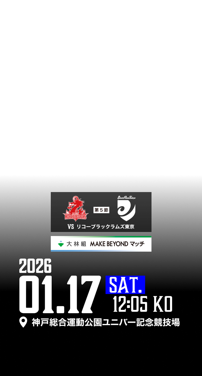 | 1月17日(土) | リコーブラックラムズ東京戦 | 神戸総合運動公園ユニバー記念競技場 | 1月8日(木) 12:00 – 1月14日(水) 11:59 |