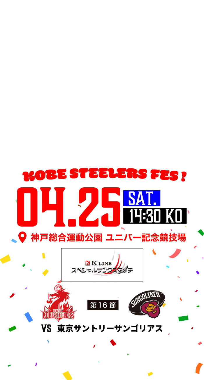 | 11月1日(土) | コベルコ神戸スティーラーズフェスタ2025 | コベルコ神戸スティーラーズラグビーグラウンド | 10月20日(月) 12:00 – 10月28日(火) 11:59 |