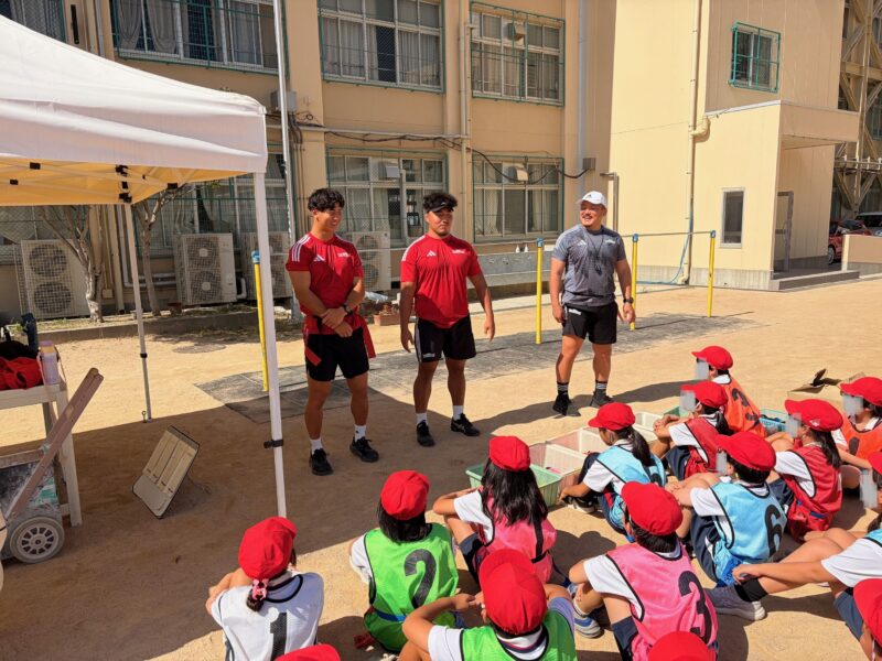 10月8日(水)に神戸市立福池小学校で森脇 光選手(PR/プロップ)、杉本 崇馬選手(WTB/ウィング)と普及・アカデミー担当の今村スタッフ、山本スタッフがタグラグビー教室を実施しました。