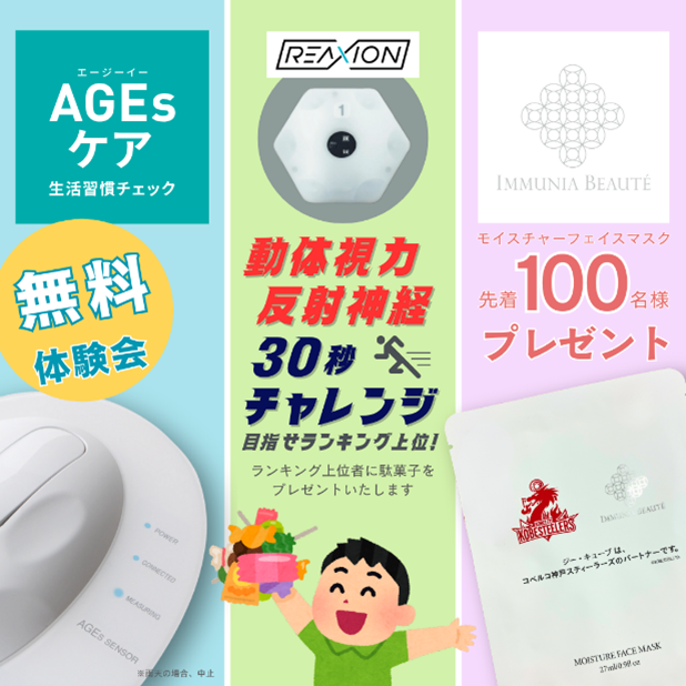 【AGEs無料測定】AGEsは、体の糖化によって生まれる“老化物質”です。 測定機器で体の糖化度をチェック!(精密機械のため雨天中止)