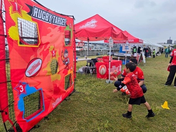 朝から雨が降ったり止んだりとあいにくのお天気でしたが、パスターゲットには、初めてラグビーボールを触るお子様からラグビー経験者の方まで約200名の方に参加いただきました。