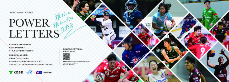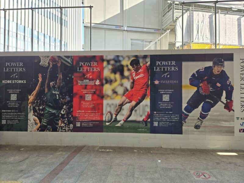JR三ノ宮駅南側に三ノ宮新駅ビルの建設工事が行われており、その工事区域の囲い壁面に「KOBE “musubu” SCREEN」と名付けられた装飾面がありますが、そこに神戸を拠点とする各スポーツチームを紹介するコーナーとしてPower of Letterが設置されることとなりました。