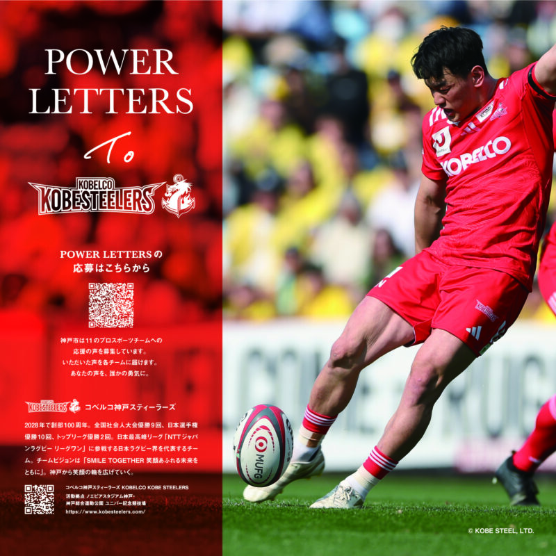 このPower of LetterはNTTジャパンラグビー リーグワン2025-26の開催期間中、設置される予定です。三宮エリアを通行される多くの人々に、より一層コベルコ神戸スティーラーズを応援いただけるよう願っております。