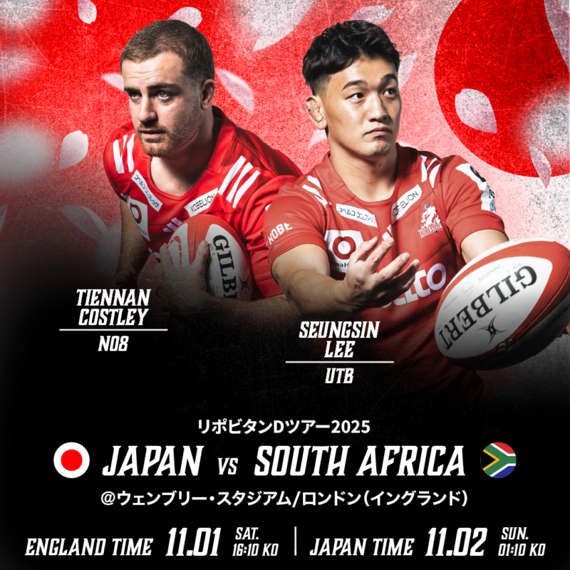 この度、ティエナン・コストリー選手、李 承信選手が11月1日(土)にウェンブリースタジアム(イングランド/ロンドン)で行われる「リポビタンDツアー2025 」南アフリカ代表戦の試合メンバーに選出されました。
