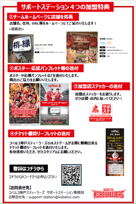 サポートステーションとは、チームポスターの掲出や、優待リーフレットの設置などチームPRの発信基地として、コベルコ神戸スティーラーズを一緒に盛り上げていただける店舗、企業、団体です。この機会に、申込フォームよりサポートステーションへのご登録をお願いいたします。