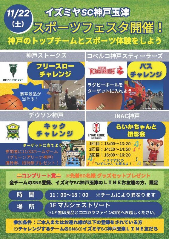 このたび11月22日(土)にイズミヤショッピングセンター神戸玉津にて開催される「スポーツフェスタ 神戸のトップチームとスポーツ体験をしよう!」に、神戸を拠点とするスポーツチームの神戸ストークス、デウソン神戸、INAC神戸レオネッサとともに参加します。