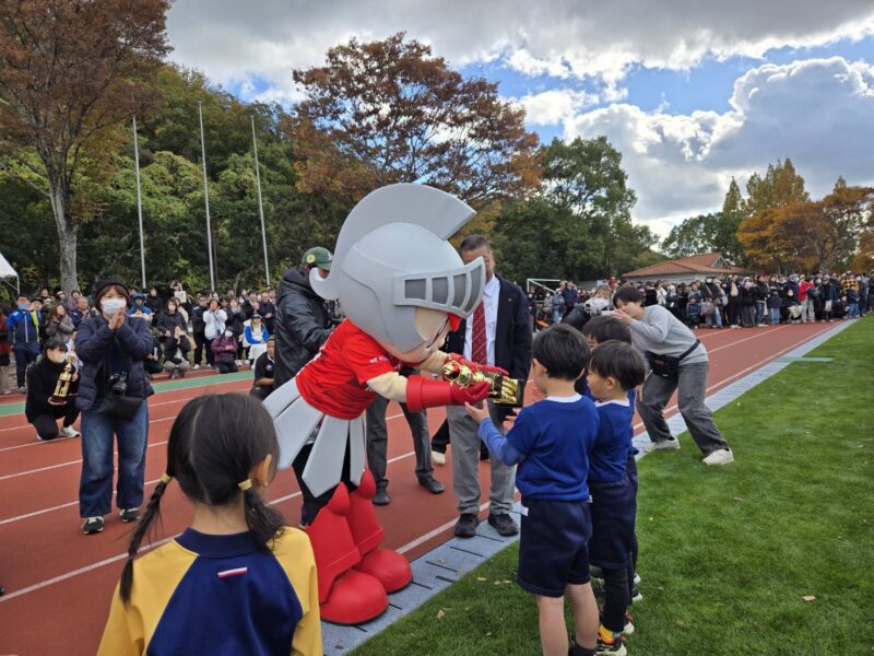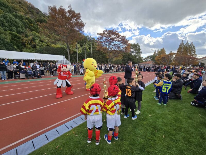 試合後の表彰式では、チームマスコットのコーロクンが、兵庫県マスコットのはばタンと一緒に登場し、プレゼンターを務めました。また各幼稚園・こども園毎に記念の集合写真を撮影しました。園児たちの笑顔があふれた一日となり、コーロクンも一緒に楽しんで参加しました。