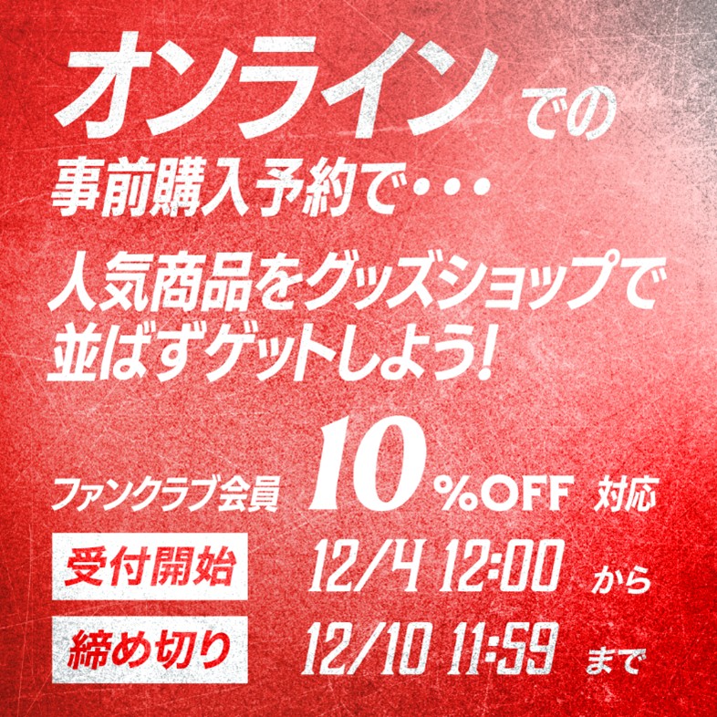 - チーム公式オンライングッズショップ内での会員登録後、ファンクラブ会員価格の適用(ファンクラブ会員の照合)まで2営業日程度いただきます。(ファンクラブ会員価格の適用開始となりましたら、チーム公式オンライングッズショップから案内メールを配信します)。万が一、会員登録後3日を目安にファンクラブ会員価格が適用されない場合は、チーム公式オンライングッズショップへお問い合わせください。