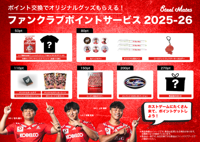 毎年多くのファンクラブ会員の皆様にご参加いただいている「ポイントサービス」を、来週開幕するNTTジャパンラグビー リーグワン2025-26も実施いたします。ポイントが獲得できるのは、ホストゲームの来場ポイントと、リーグ戦18試合で実施予定の「ラストトライクイズ」で正解したら貰えるポイントの2パターンです。無料会員も参加対象となりますので、ぜひこの機会にファンクラブにご入会いただき、非売品アイテムがゲットできる「ポイントサービス」にご参加ください!