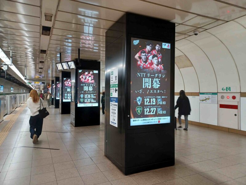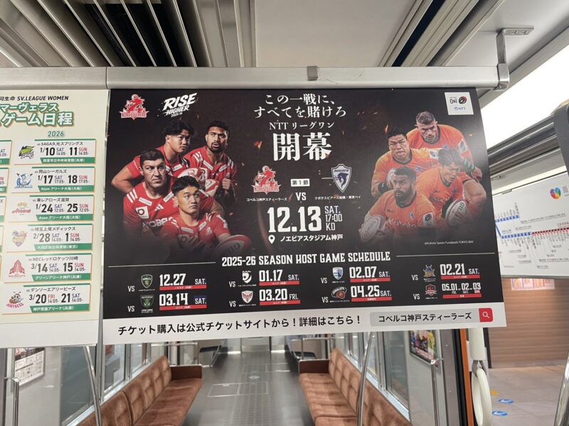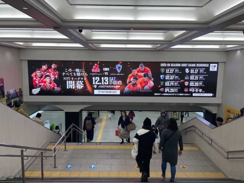 NTTジャパンラグビー リーグワン2025-26の開幕に向けて、神戸のシンボルロード「フラワーロード」に選手写真を使用した装飾バナーを設置しました。その他、神戸三宮・大阪梅田を中心に「阪神電車」「神戸市営地下鉄」への車内吊り広告やデジタルサイネージ広告も展開しております。