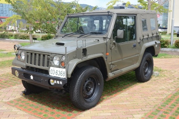 自衛隊で使われている小型の輸送用車両です。約500kgの荷物を運べる車両で、人員や装備、物資の運搬など、さまざまな場面で使われています。車体はコンパクトで取り回しがよく、舗装されていない道や狭い場所でも走行しやすいのが特徴です。