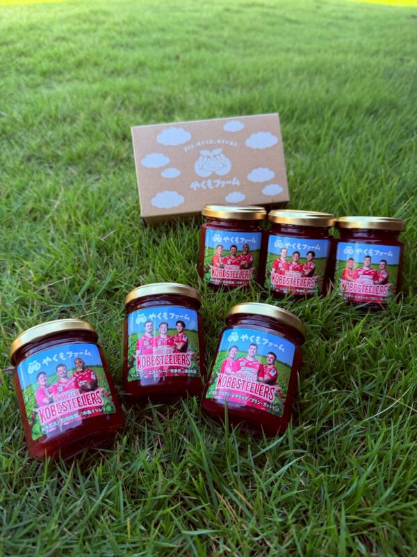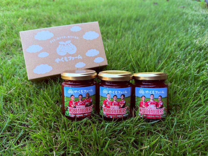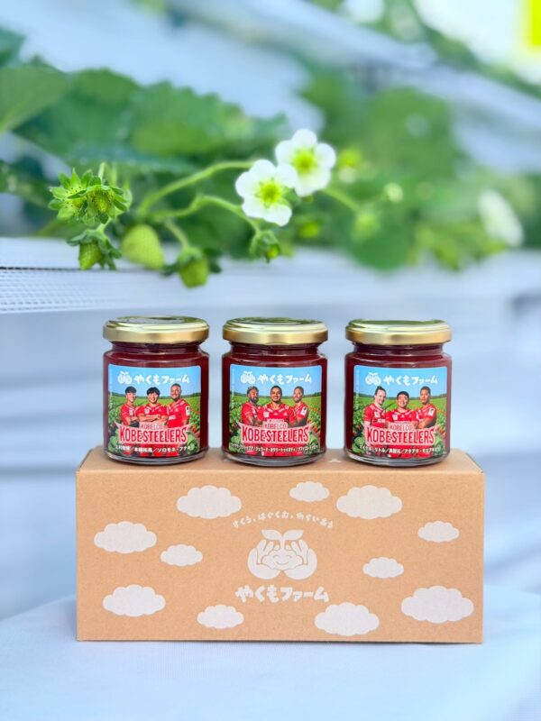 このたび、コベルコ神戸スティーラーズの選手がラベルに登場する特別仕様の完熟いちごジャム 限定「コラボラベル」をやくもファームより販売いたします。真っ赤に輝くコベルコ神戸スティーラーズを想わせる、やくもファーム自慢の完熟いちごが瓶の中に詰まった特別なジャムです。ぜひお楽しみください。