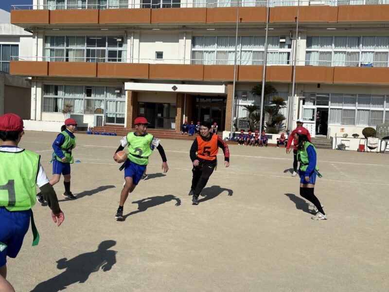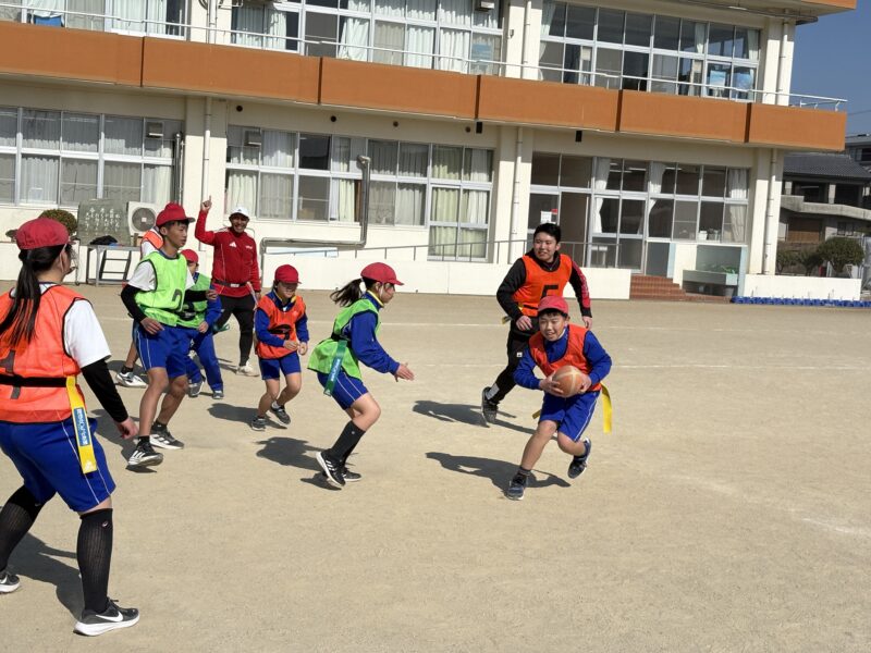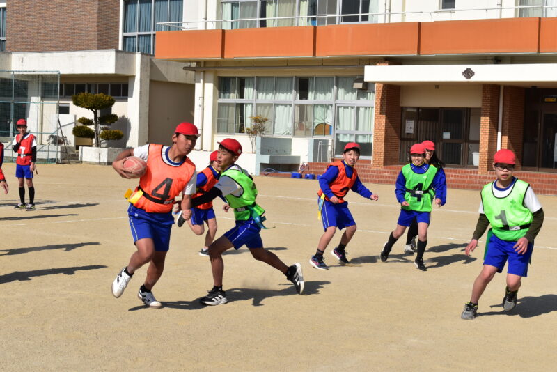2月4日(水)に洲本市立堺小学校で、普及・アカデミー担当の今村スタッフがタグラグビー教室を実施しました。