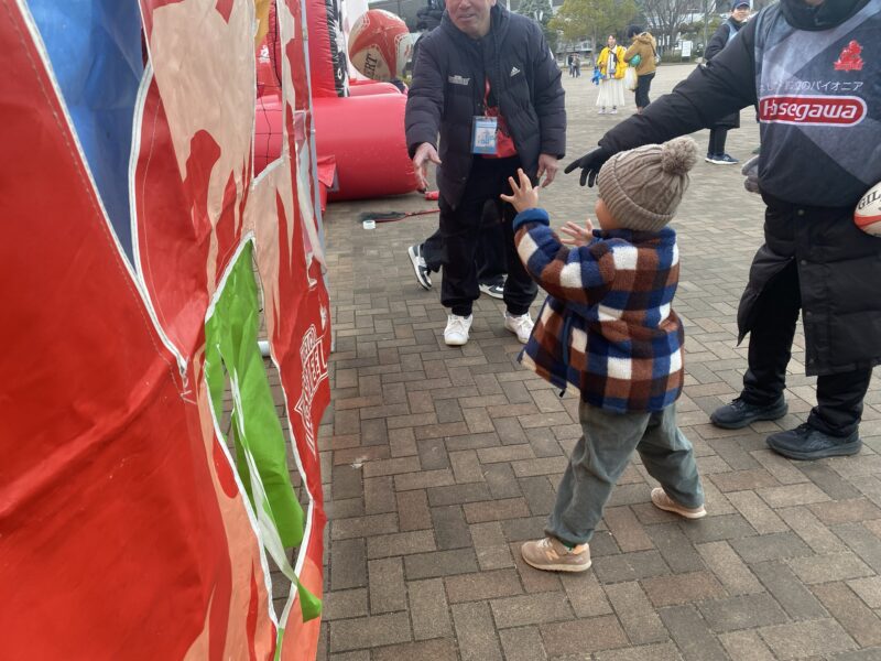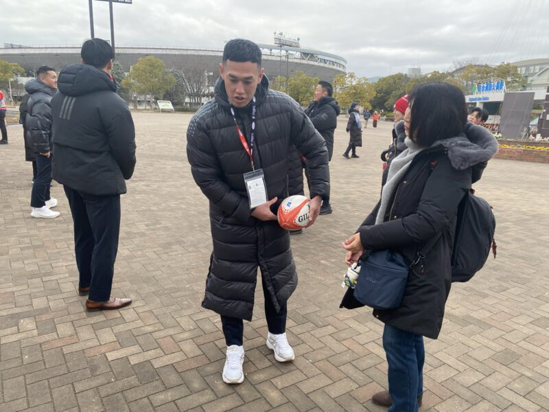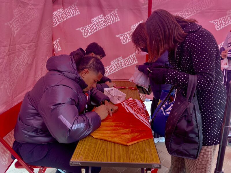 「自衛隊コラボイベント」では特殊車両展示をはじめ、陸海空自衛隊の制服を着て特殊車両と一緒に記念撮影ができるコーナーやラジオ体操よりも少しハードな自衛隊体操を体験できるコーナーなど、楽しい企画がズラリ。自衛隊兵庫地方協力本部のマスコットキャラクター「ひょうちん」も登場し、コーロクンと一緒に自衛隊体操したり、ファンサービスをしたり、大いに盛り上げてくれました。また、ホストゲーム恒例のラグビー体験コーナーにはサラマンダーズ(試合メンバー以外の選手)のメンバーが登場し、参加者にキックの蹴り方やパスの投げ方を教えるだけでなく、写真撮影やサインに応じる場面も。オフィシャルグッズショップではグッズの購入金額が5,000円以上の方を対象に先着120名様限定でアタアタ・モエアキオラ選手と船曳 涼太選手のサイン会を行い、皆様との交流の時間を設けさせていただきました。会場では来場者皆様に神戸製鋼所の鉄粉を使用している桐灰小林製薬株式会社提供の「桐灰カイロ」のプレゼントも行い、寒い冬のラグビー観戦にお役立ていただくほか、豪華賞品が当たる「ハーフタイム抽選会」も実施し、心も体もあたたまるような企画でスティールメイツとレヴニスタをおもてなし。今節も試合前から楽しいイベントが盛りだくさんとなりました。