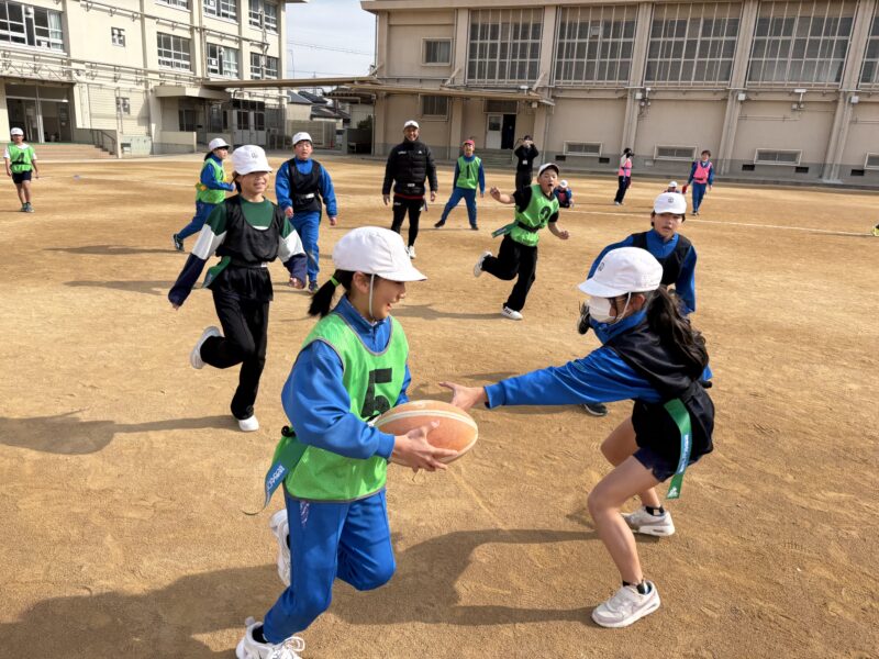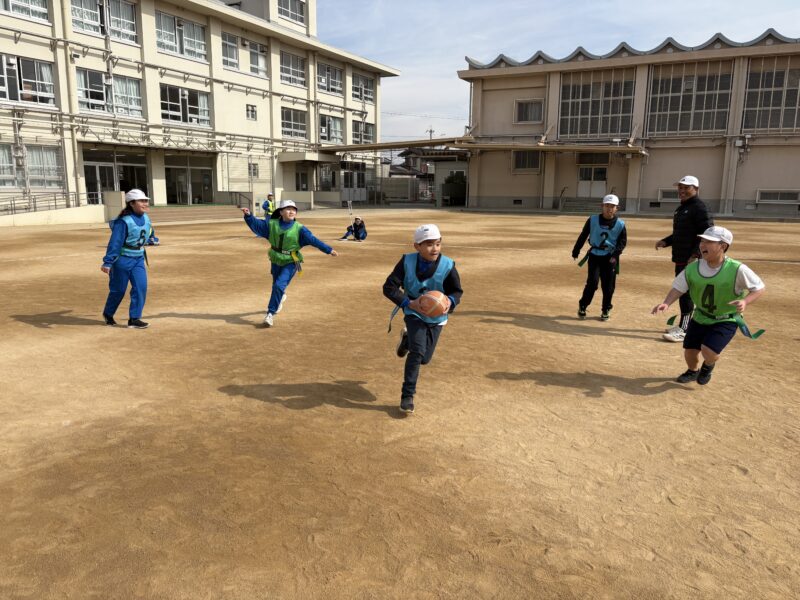 2月10日(火)に播磨町立播磨小学校で、普及・アカデミー担当の今村スタッフと山本スタッフがタグラグビー教室を実施しました。