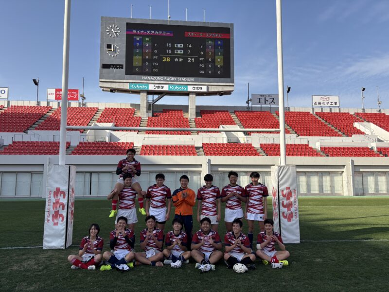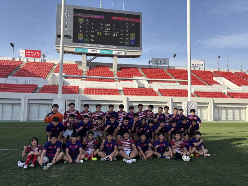東大阪市花園ラグビー場第1グラウンドで試合をさせてもらえたこと、本当に良かったと思います。アカデミー生からは、「普段より緊張する」という声も出ておりました。この日は3年生の参加者が少なく、2年生の力も借りて試合しました。ボールがうまく繋がる時はトライをとれていたのですが、こちらのミスで相手にボールを取られてトライされるといった試合展開でした。アタックし続けるには何が必要か考え、3年生には卒業後もそれぞれの進路で忘れずに取り組んでほしいです!2年生はこの経験を活かして、来年リベンジ出来るよう頑張っていきましょう!