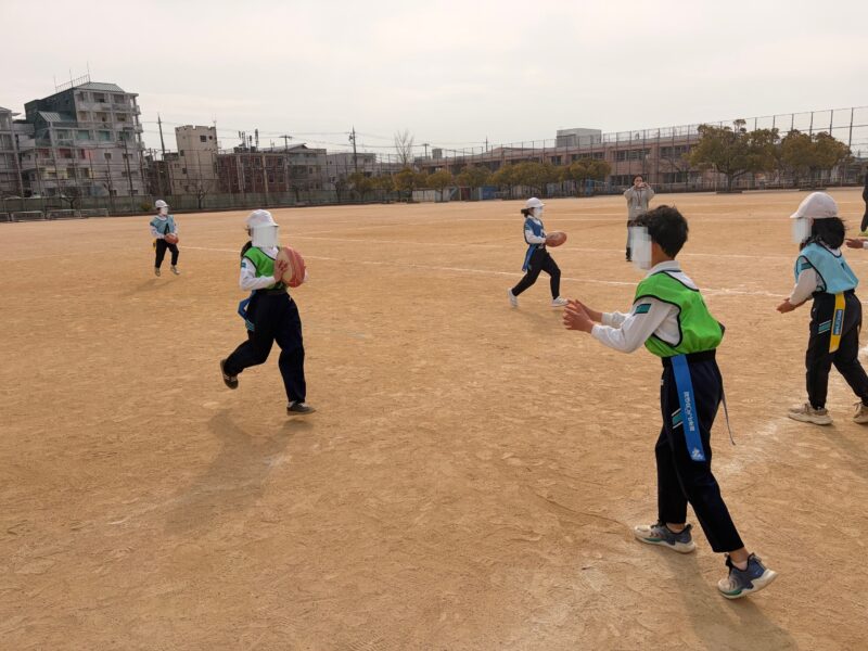 2月20日(金)に神戸市立春日台小学校で、普及・アカデミー担当の今村スタッフと山本スタッフがタグラグビー教室を実施しました。