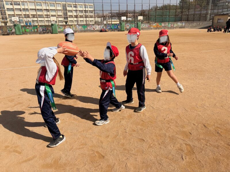 初めてラグビーをする子どもたちばかりで、最初はルールに戸惑う場面もありましたが、みんな積極的に参加してくれて元気いっぱい楽しんでくれました。次の体育の授業からタグラグビーを始めるそうなので、今日学んだことを活かしてタグラグビーを楽しんでほしいです!