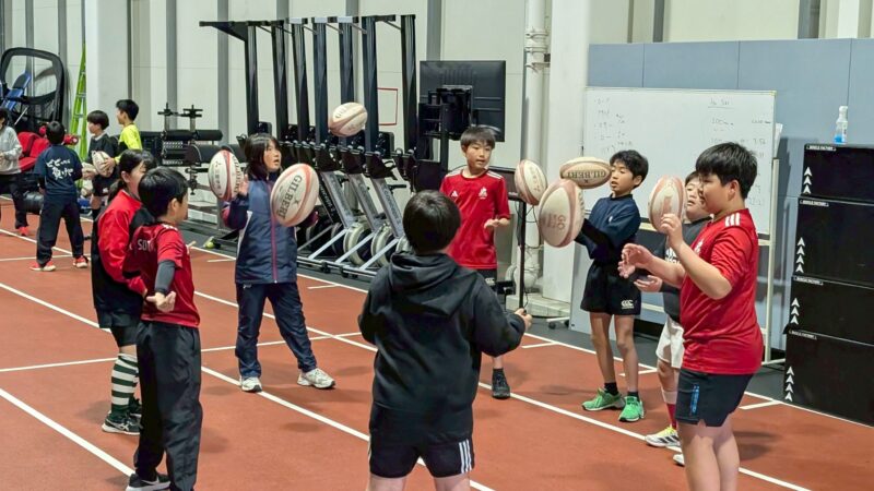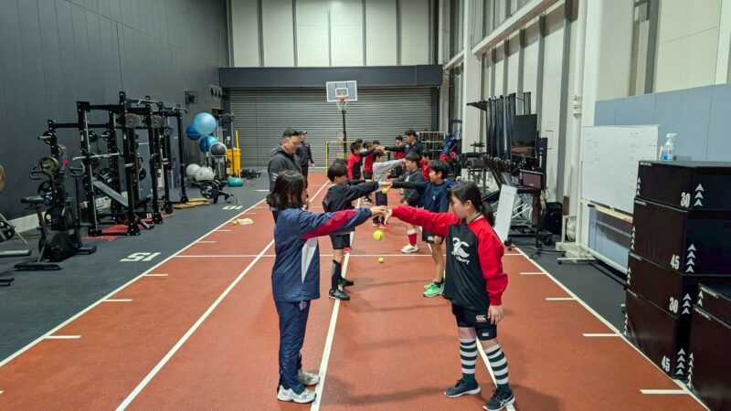 小学生コースでは、ボールキャリアのトライラック、ロングリリースの動きを練習しました。タックルをされた時にトライラックでボールを守り、ロングリリースで味方に良い球を出すことを意識しました。森田コーチによるハンドリングの練習では、ハンズキャッチを意識した練習をしました。